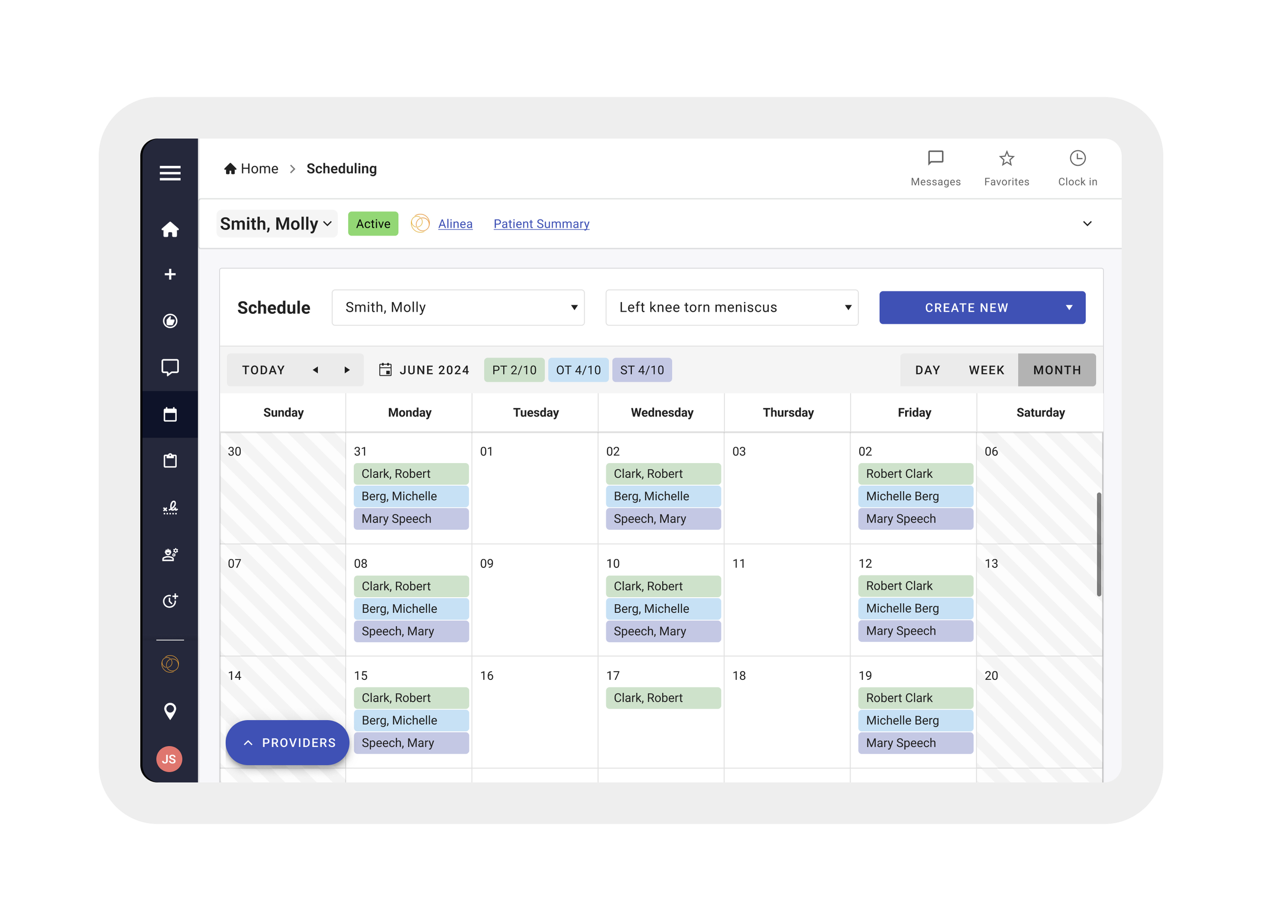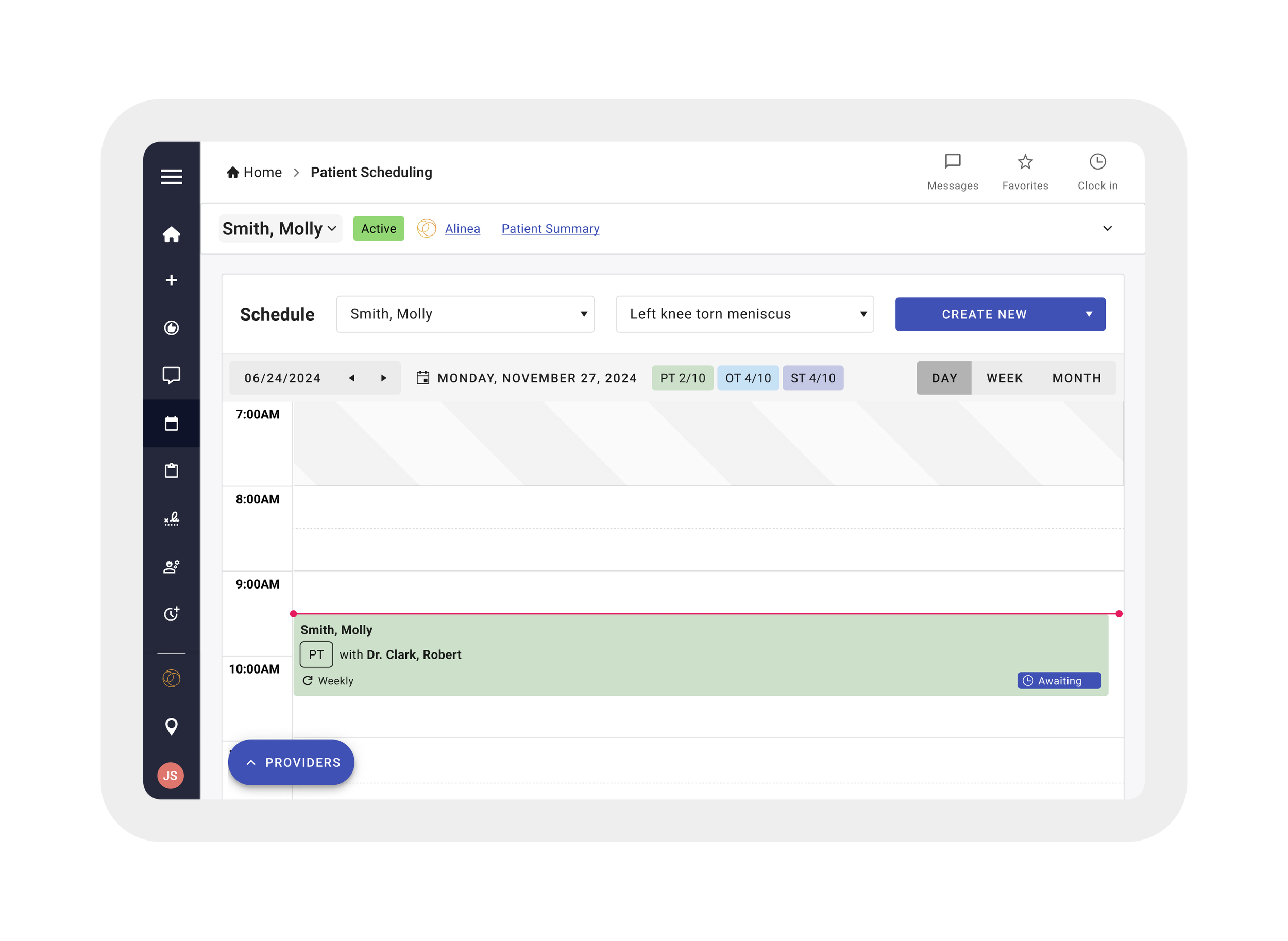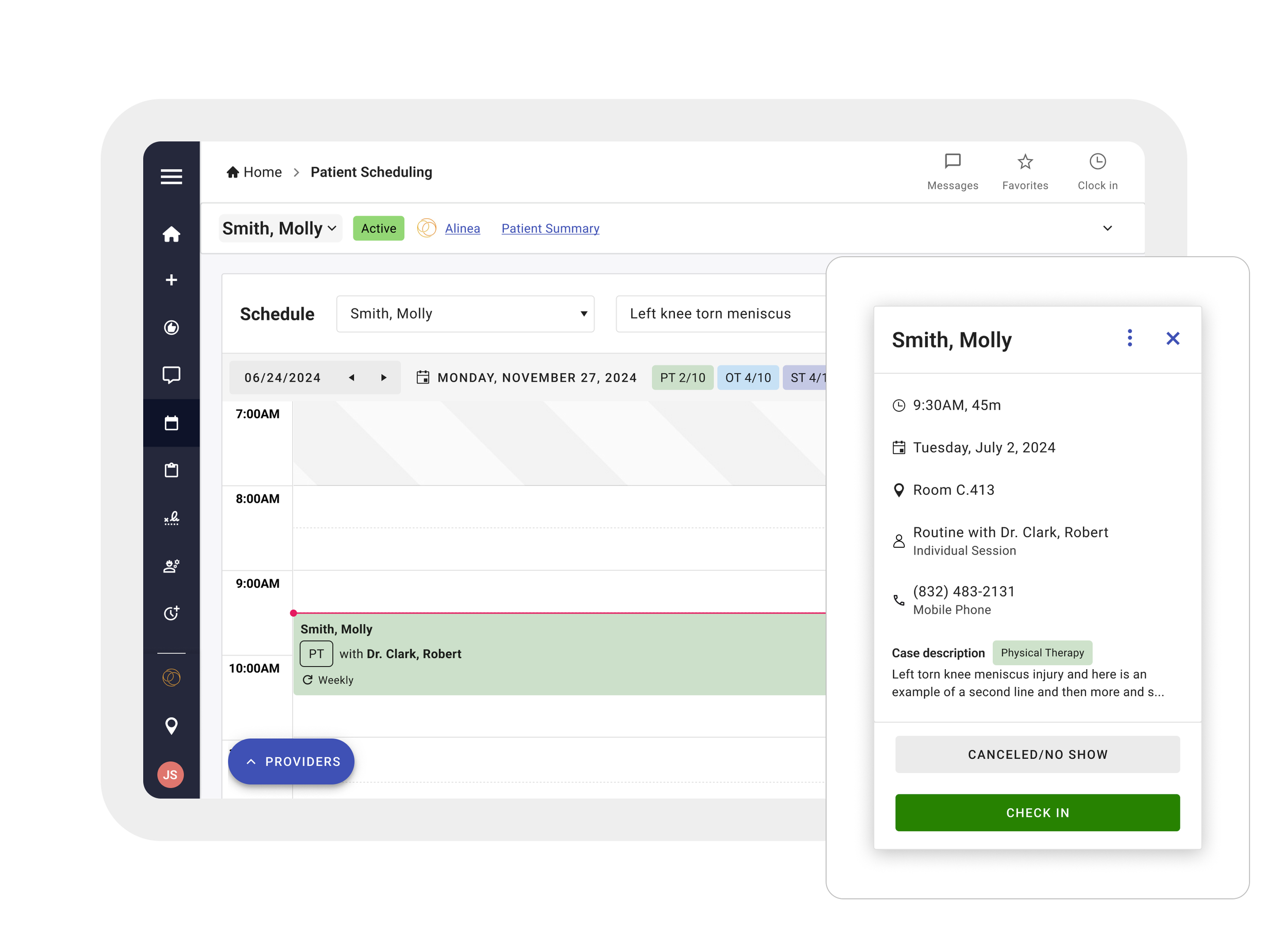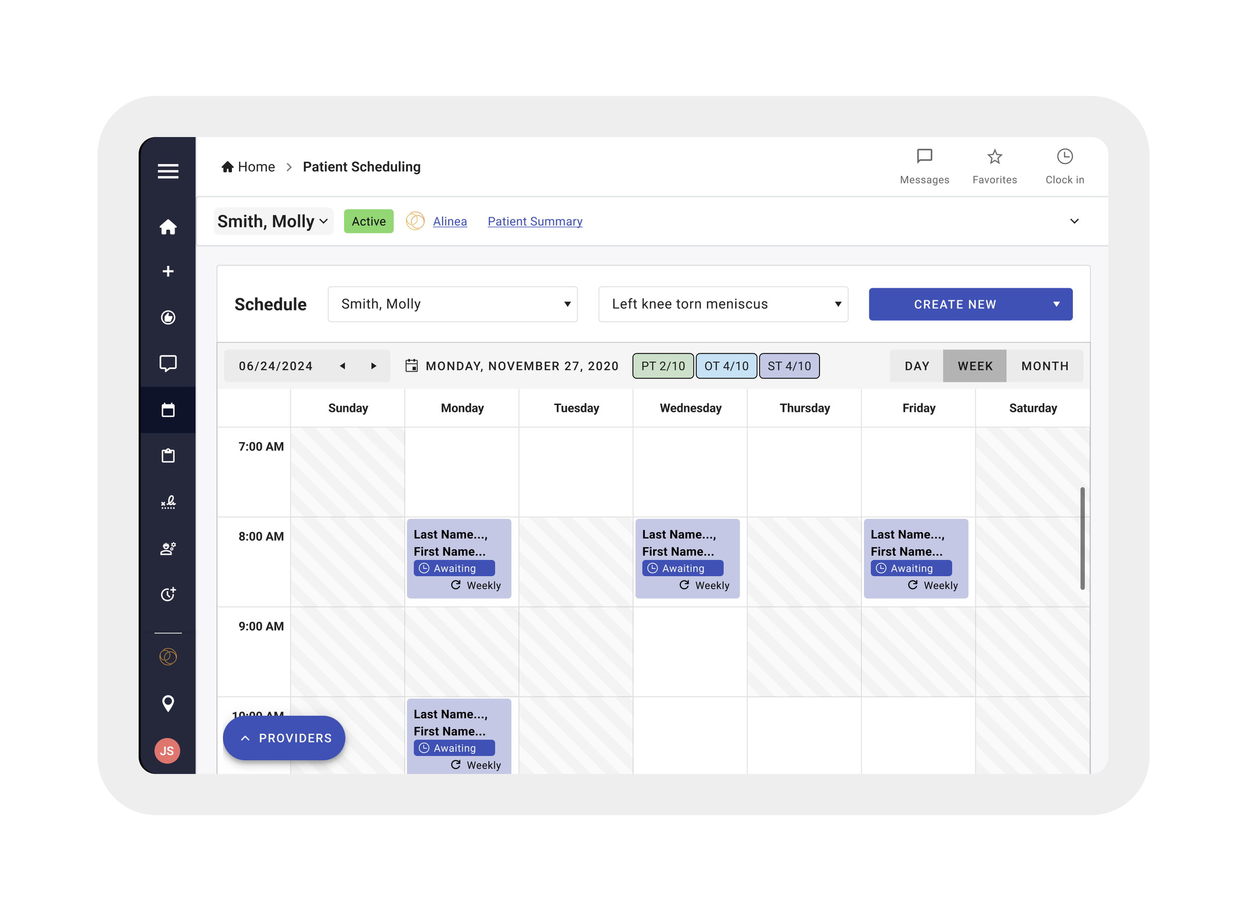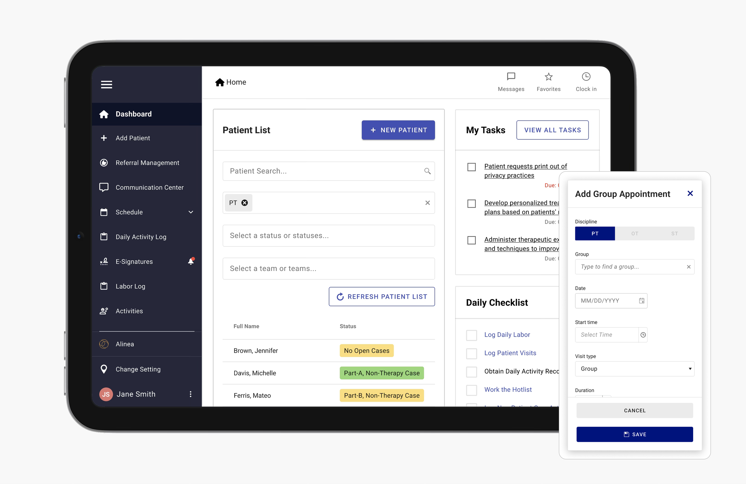 The updated home page gives therapists and admins a clear, at-a-glance view of their daily priorities—making it easier to understand schedules, tasks, and patient needs right from the start. Additionally, the left side menu now houses every place a user might need to navigate to.