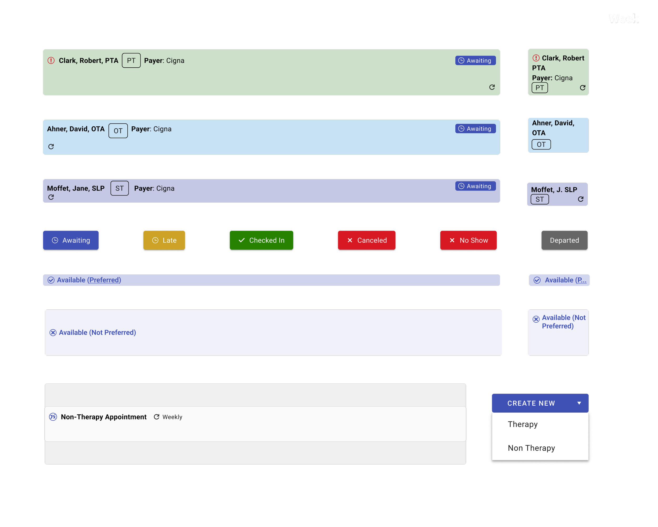 We created components signifying various therapy disciplines, non-therapy, preferred working hours, and appointment status.
